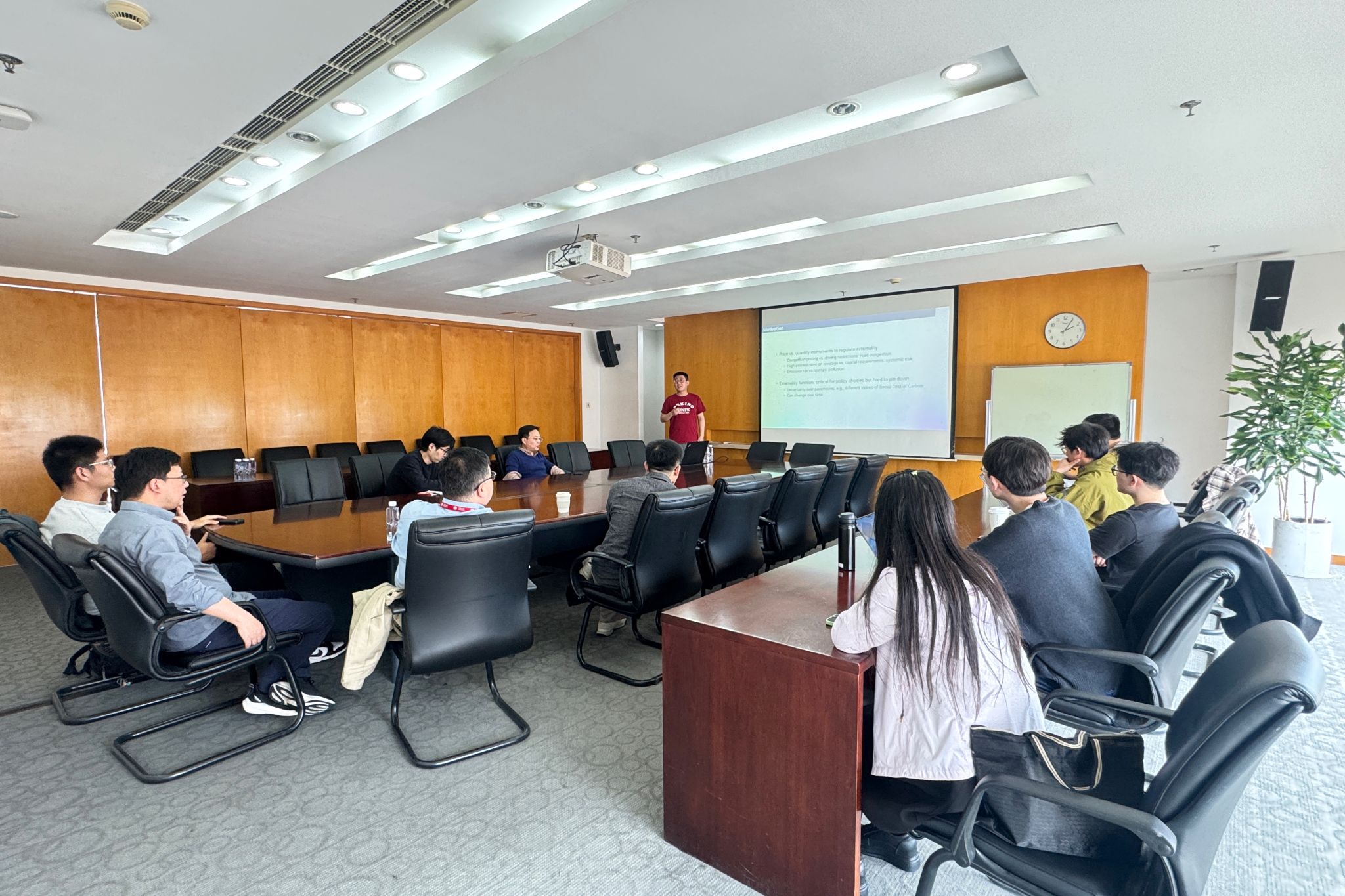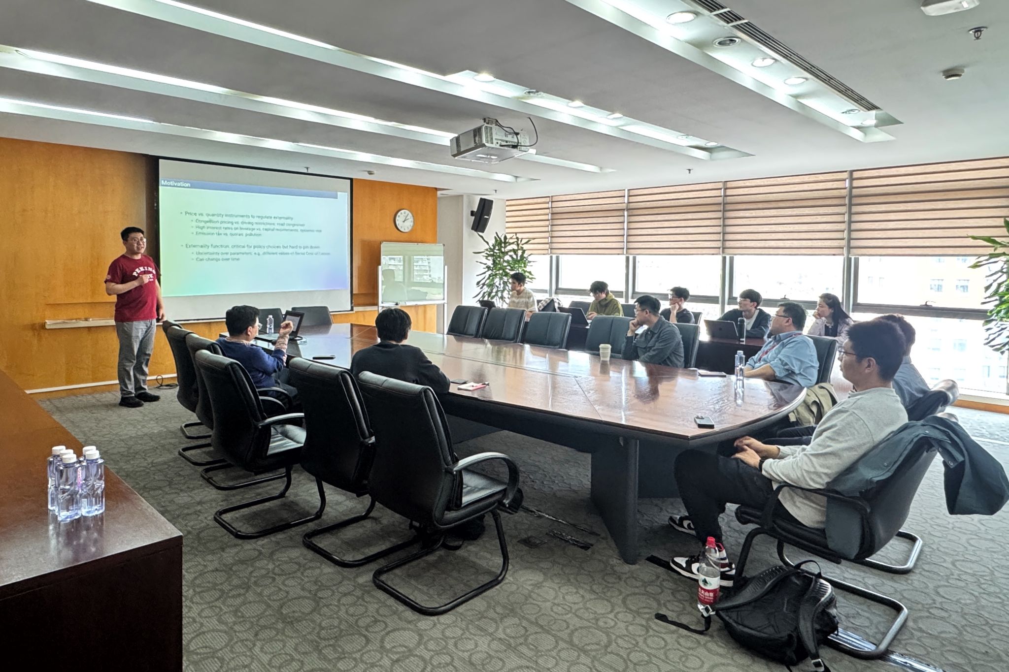 报告围绕负外部性治理中的政策工具选择展开,重点比较价格型政策与数量型政策在福利效果上的差异。仇老师指出,在环境治理、资源调控等现实场景中,政府通常面临税收、配额与直接生产限制等多种政策工具的选择。然而,由于外部损失函数往往难以被准确观测和刻画,不同工具之间的优劣并不容易直接判断。基于这一问题,论文提出了一种在较弱假设下比较政策效果的分析框架,为评估不同规制工具的社会福利表现提供了新的思路。