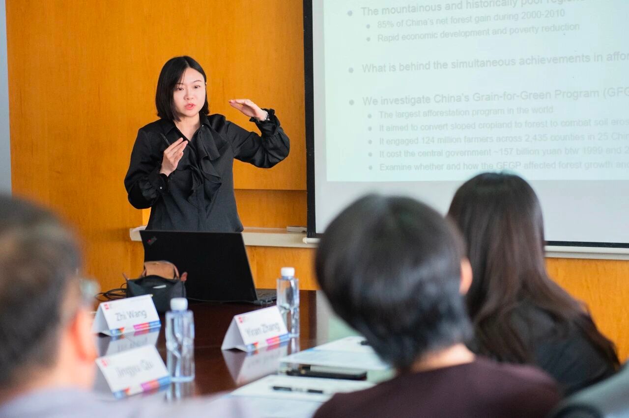 复旦大学王之副教授分享的题目为“Greening along the Slope and Resource Reallocation: Evidence from China's Grain for Green Program”。该研究整合高分辨率卫星遥感数据与县级社会经济面板数据,运用交错双重差分与事件研究法系统评估了中国退耕还林项目对森林增长与农业生产的综合影响。研究发现,该项目显著促进了陡坡地区的耕地向林地转化,贡献了2000至2010年间中国丘陵地区净森林增长量的24.26%。更为重要的是,该项目并未以牺牲粮食安全作为代价,反而通过推动农业资源从低产坡地向高产平原地区的重新配置,显著提升了县域粮食产量。进一步分析表明,该成效依赖于两大关键条件:充足的平原耕地资源作为迁移基础,以及地方政府在农业基础设施上的配套投入。该研究不仅证实了生态修复与农业发展可协同推进,也为全球面临类似挑战的地区提供了“中国经验”。
