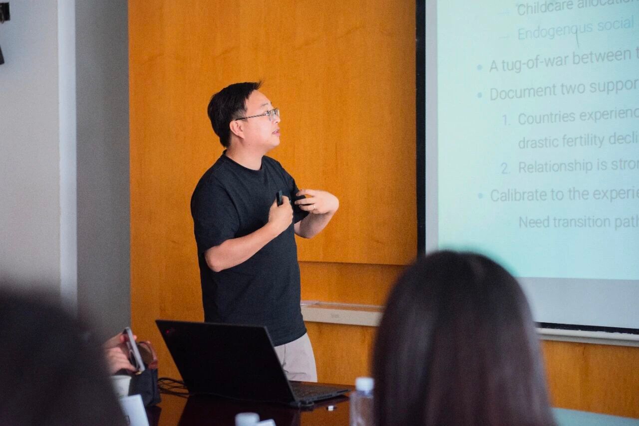 复旦大学奚锡灿副教授分享的题目为“The Fertility Race Between Technology and Social Norms”。该研究构建了一个内含社会规范形成机制的理论模型,为解读东亚社会(如韩国、中国)在经济腾飞后面临的低生育率挑战提供了新颖视角。研究核心论点是:技术变革迅猛提升了女性工资水平与劳动参与率,而强调“女性为主承担家务”的传统社会规范却变化迟缓。二者变化速度失衡显著提高了生育成本,迫使年轻家庭在育儿分工上做出高成本、低效率的妥协,从而强烈抑制了生育意愿。政策模拟结表明,针对女性的育儿补贴虽能在短期内提振生育率,但会固化不平等的分工模式;而补贴男性育儿则能从根本上加速社会规范向性别平等方向演进,从而实现更可持续的长期生育率回升。这一发现为面临“未富先老”挑战的经济体指明了可能的政策方向。