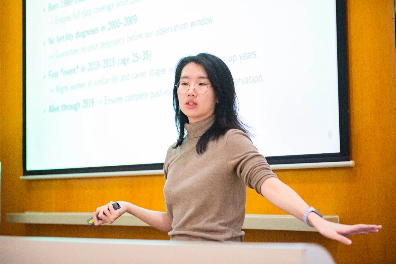 复旦大学的丁晖报告了题为 “Delays in Motherhood: Differentiating the Effects of Birth and Miscarriage”的研究,利用自然流产事件探讨生育带来的“母职惩罚”效应。研究将女性分为三组:从未生育、经历流产和已生育,分析生育事件对收入的影响。结果表明,生育后女性收入显著下降,而意外自然流产的女性收入损失明显低于生育组,说明如果推迟生育的话,母职惩罚将会更小一些。进一步的异质性分析显示,孕期年龄越小的女性,流产与生育之间的收入差距越大。这一发现揭示了生育决策对女性劳动市场回报的长期影响,为政策设计与性别平等研究提供了新的视角。