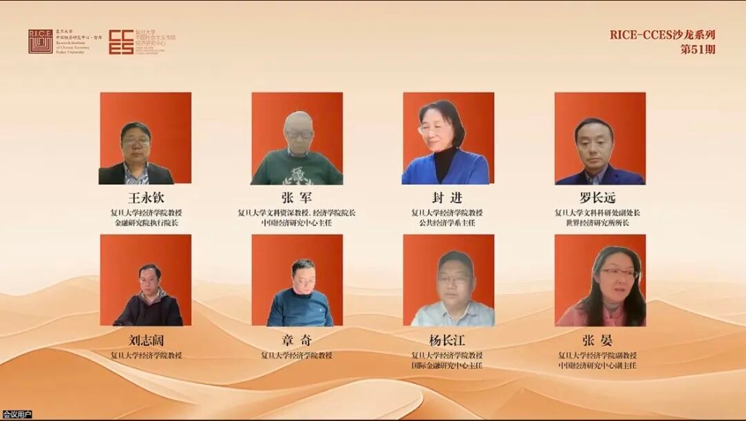 2026年3月13日,第51期RICE-CCES沙龙“从政府工作报告展望十五五经济前景”在线上召开并同步直播,讲座由上海高校智库——复旦大学中国经济研究中心(RICE)、复旦大学中国社会主义市场经济研究中心(CCES)联合主办。复旦大学经济学院张军、封进、王永钦、杨长江、罗长远、章奇、刘志阔等多位专家学者出席讲座,共同研判十五五经济前景,讲座由中国经济研究中心副主任张晏老师主持。