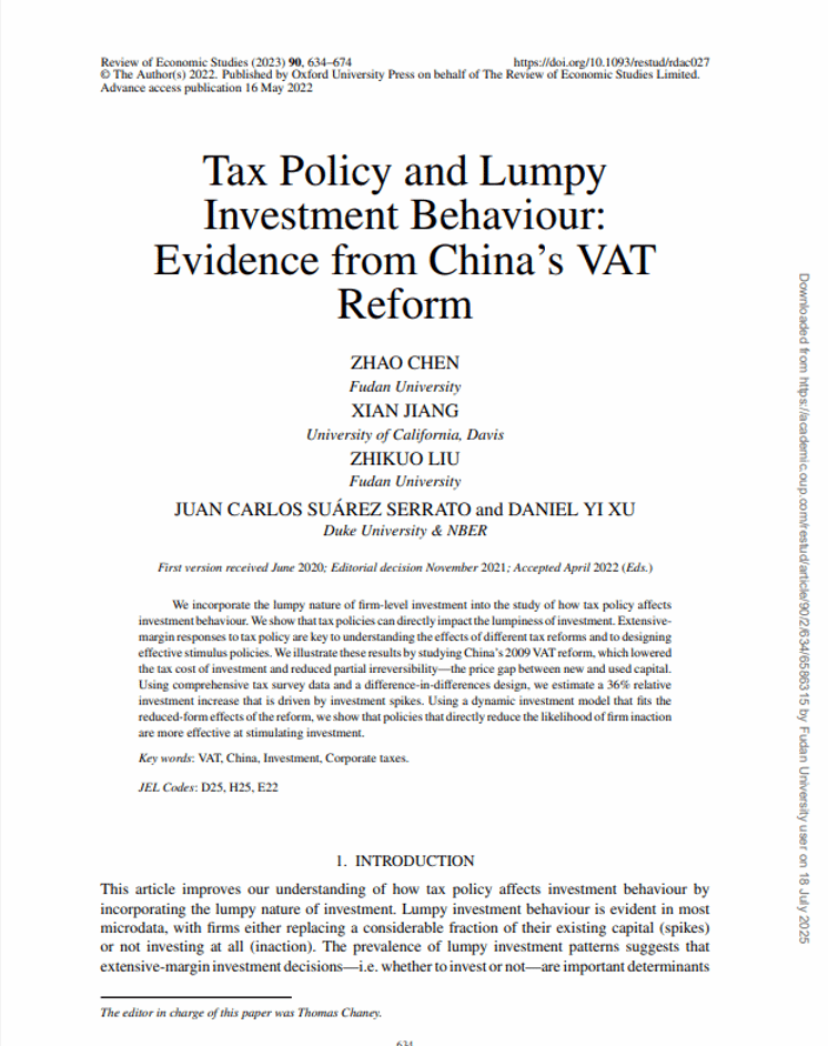 成果名称:Chen Z, Jiang X, Liu Z, Serrato J and Xu D, Tax Policy and Lumpy Investment Behavior: Evidence from China’s VAT Reform(税收政策与企业投资:来自中国增值税改革的证据),Review of Economic Studies,Volume 90, Issue 2, March 2023, Pages 634–674.