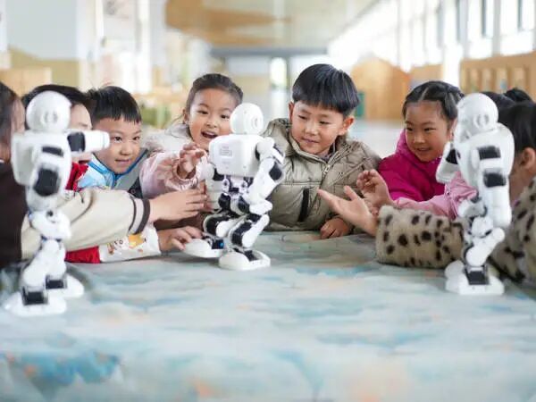 2025年12月17日,在江苏省泰州市姜堰区三水幼儿园,孩子们与智能机器人互动。
