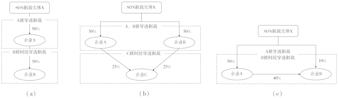 若被SDN实体穿透的多家企业间存在股权关联,如图12(c)所示,SDN制裁实体X直接拥有企业A 50%的股份和企业B 10%的股份,企业A被穿透制裁;同时,企业A还拥有企业B 40%的股份。因此,实体X直接拥有企业B10%的股份并通过企业A间接拥有40%的股份,合计持股50%,满足穿透制裁规则,最终企业B仍将受到间接的穿透制裁。总之,SDN旨在通过上述股权穿透规则来扩大SDN清单的制裁范围,防止被制裁实体利用关联企业规避制裁。