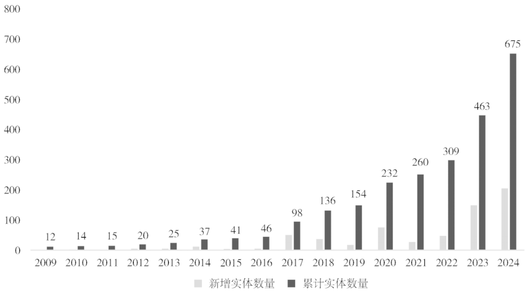 在全球数据中本文聚焦对华制裁情况,发现实体清单呈现出贸易战后制裁升级的阶段性特征。如图5所示,在2009—2017年间,实体清单纳入中国实体的增速较为平缓,仅从2009年的30家增至2017年的155家,表明美国尚未释放全面对华制裁信号。然而从2018年以来,清单内的中国实体数量迅速攀升,从207家迅速增至1015家,与第二阶段的增长数量相比,在更短时间内实现了5倍于基期的增长。